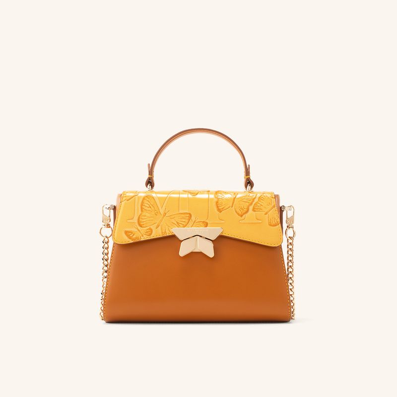 El amarillo quemado, ese que recuerda el color de la mostaza Dijón, le pone un toque otoñal a esta versión de la colección emblemática de la marca, que hace que las mariposas resalten sobre el piel, gracias a un efecto "quemado", creado manualmente en Italia mediante una técnica conocida como tamponado. El tono protagonista contrasta, y a la vez se complementa de manera armoniosa, con un cuero liso canela que baña las manijas y la base de carteras y billeteras.