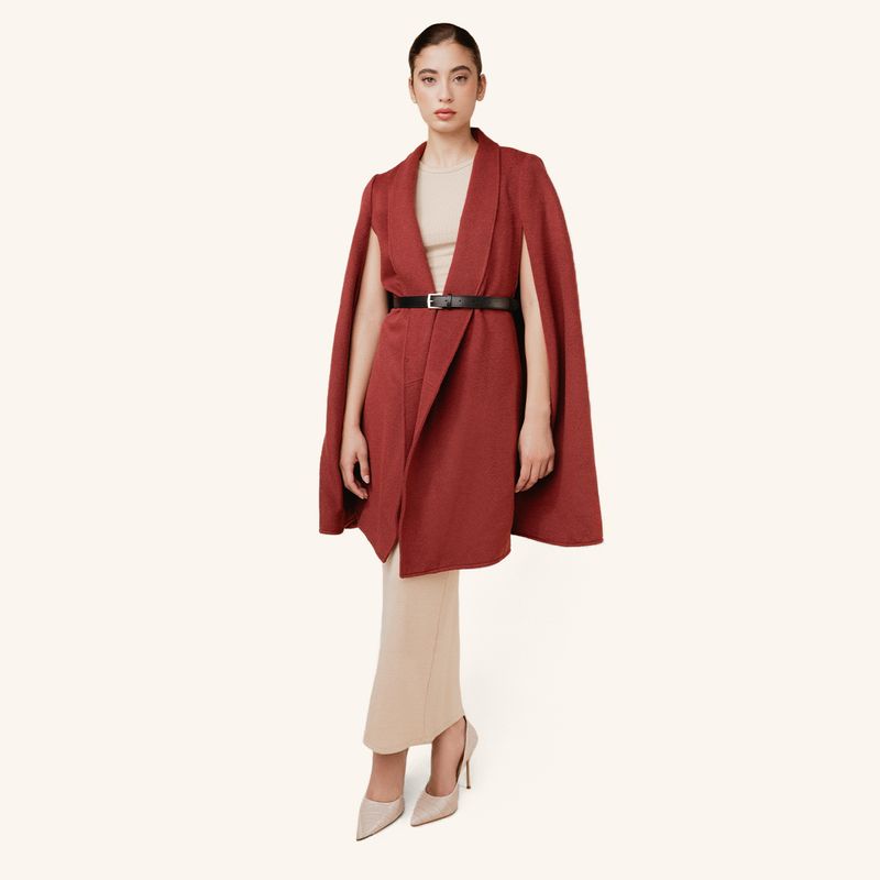Confeccionada en baby alpaca de origen peruano, esta capa ofrece una textura suave y ligera que brinda calidez con un acabado distinguido. Su diseño tipo smoking se complementa con un cinturón que define la silueta, mientras los detalles en cuero y cristales Swarovski aportan puntos de luz y contraste táctil al diseño.