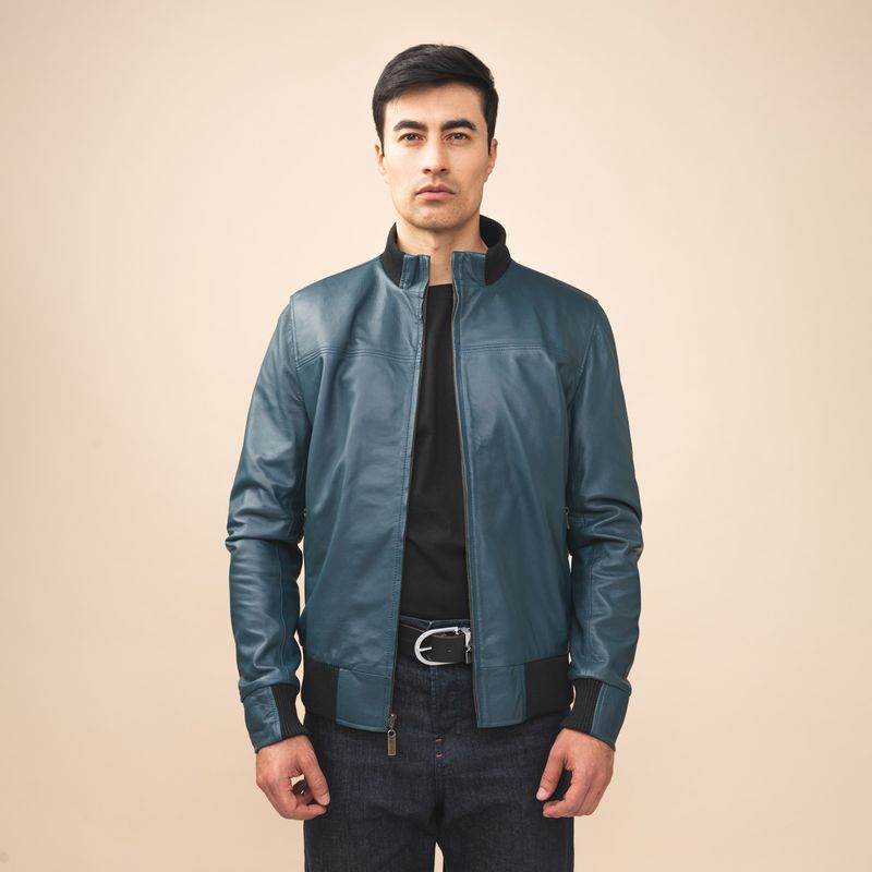 Esta chaqueta tipo bomber en cuero ofrece una textura suave y una estructura ligera que facilita el movimiento. Su diseño en tono azul incluye un cierre de cremallera frontal y dos bolsillos externos de fácil acceso para organizar elementos esenciales durante el día.