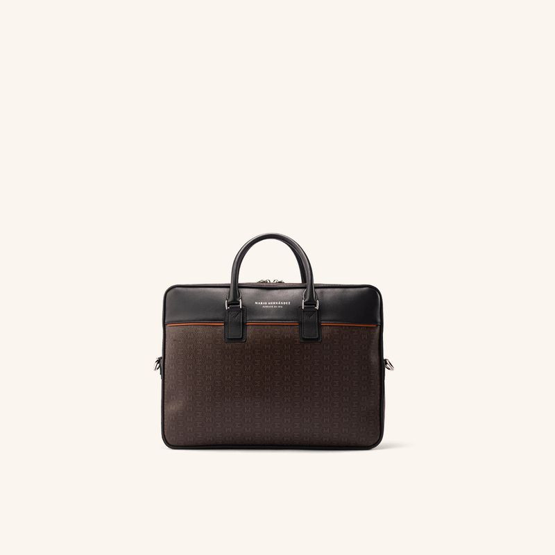 Este portafolio, ligero y de diseño impecable, presenta un innovador patrón MH Palenque con ondas entrelazadas, elaborado en lona sintética texturizada y detalles en cuero vacuno liso. Su construcción limpia y su tonalidad café lo hacen ideal para el hombre contemporáneo que busca funcionalidad y estilo en su día a día. Los herrajes en zamac con acabados en níquel y negro níquel complementan su diseño, ofreciendo durabilidad y un toque distinguido.