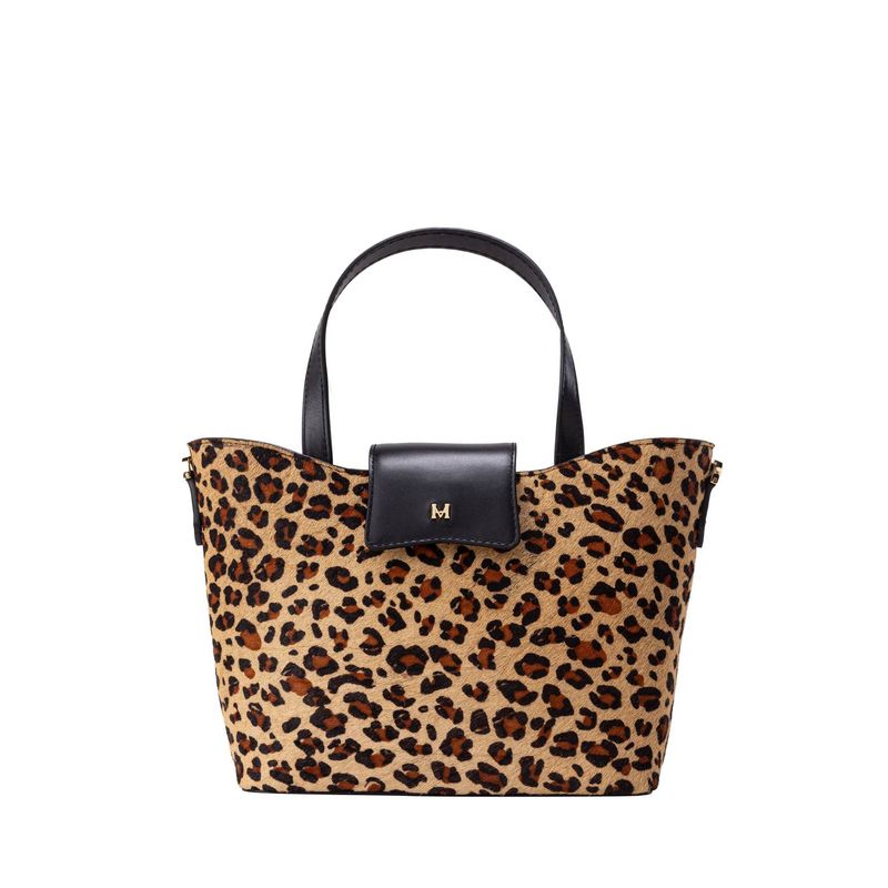 Este bolso tote en cuero vacuno con acabado en pelo destaca por su textura de leopardo en tonalidad dorada, aportando un estilo distintivo. Su diseño funcional integra un compartimento principal de gran capacidad con cierre y broche, ideal para organizar elementos esenciales en eventos formales o salidas casuales.